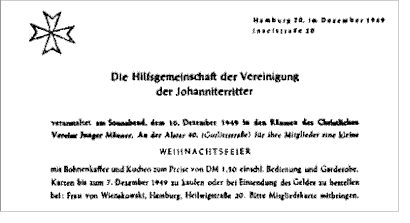 Der Beginn 1948 - 1952 Vor und nach der Kapitulation im Mai 1945 trafen viele Flüchtlinge und Heimatvertriebene aus Mittel- und Ostdeutschland auch in Hamburg ein. Sie waren vor der sowjetischen Armee, später aus der sowjetischen Besatzungszone geflohen bzw. aus ihrer Heimat vertrieben worden. Die Not unter diesen, vom Schicksal hart getroffenen Menschen war groß, nicht nur in materieller Hinsicht. Rat und Tat waren in vieler Hinsicht gefragt. Das galt in gleicher Weise für die Kriegsversehrten, Bombengeschädigten, die Kriegsgefangenen in Russland usw. und nicht zuletzt für die Kinder. Unter den Flüchtlingen und Heimatvertriebenen befand sich auch eine Zahl von Angehörigen adliger Familien, unter ihnen Ritter des Johanniterordens. Aus diesem Kreis kam Anfang 1948 unter der Federführung des RR Dr. von Koppenfels die Anregung, eine Vereinigung des Johanniterordens in der Hansestadt Hamburg zu gründen. Dieser Zusammenschluss sollte auch in der Tradition des Ordens dazu beitragen, die geschilderten Nöte zu lindern. Dies entsprach der Aufbruchstimmung, die Anfang 1948 in der späteren Bundesrepublik aufkam und durch die Währungsreform Mitte des Jahres stark gefördert wurde. Der Vorschlag eines Zusammenschlusses wurde am 4.2.1948 im Hause der Gräfin Lüttichau erstmalig besprochen. An dem Treffen nahmen 20 Damen und Herren teil. Als Alternative bot sich an, die ehem. Landesabteilung der deutschen Adelsgenossenschaft aufleben zu lassen. Dagegen wurden Bedenken erhoben. Die Adelsgenossenschaft war zwar nicht verboten, aber damals auch nicht gern gesehen. Schwerwiegender war, dass seit 1948 Bürgerliche in den Johanniterorden aufgenommen wurden. Die Vorbesprechungen mit der Ordensregierung entwickelten sich so positiv, dass in Hamburg am 6.4.1948 eine weitere Zusammenkunft stattfand, an der der Ordenskanzler Graf Arnim teilnahm. Er billigte den Plan, nachdem einige Bedenken ausgeräumt werden konnten. Es folgte dann der Auftrag des Herrenmeisters Oskar Prinz von Preußen an RR Dr. von Koppenfels, eine Vereinigung des Johanniterordens in der Hansestadt zu gründen. Am 7.12.1948 fand eine erste Zusammenkunft